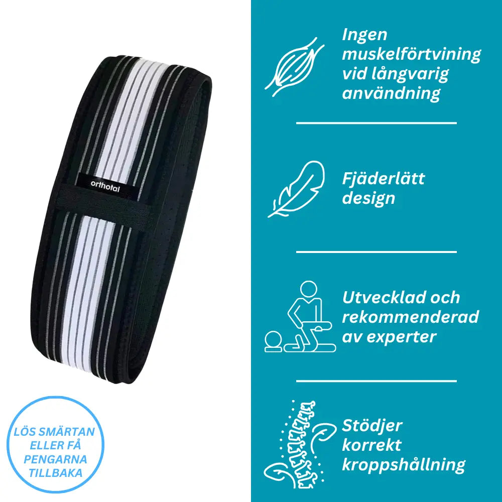 Ortobältet har utvecklats specifikt för att ge ryggraden en naturlig hållning och samtidigt fördela trycket jämnt över ryggkotorna.